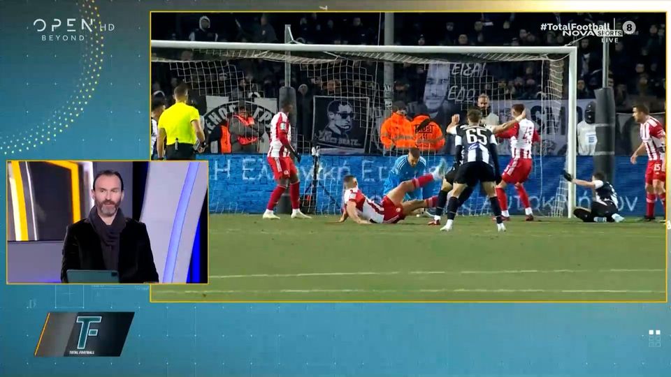 Ο νεαρός παίκτης του Δικεφάλου πέφτει στο έδαφος και ο Αυστριακός Βάινμπεργκερ δείχνει την λευκή βούλα. Από το VAR όμως του λένε να ξαναδεί την φάση και τελικά αλλάζει απόφαση, κάτι που είχε γίνει και στην φάση του νικητήριου πέναλτι του Παναθηναϊκού, στην οποία δεν είχε καταλογίζει παράβαση στην κανονική ροή της αναμέτρησης.